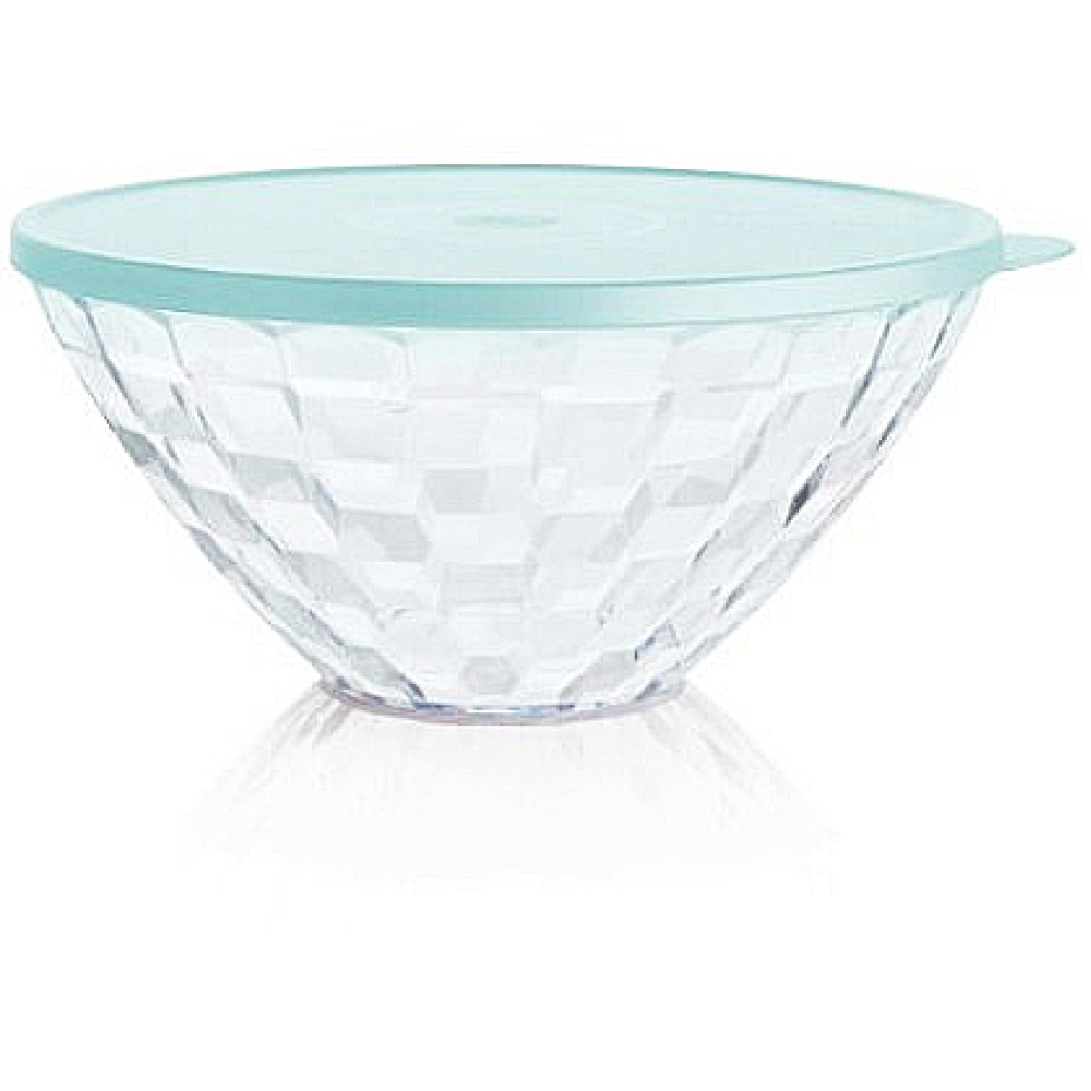 Нарежьте заранее салат в чашу, а перед приходом гостей заправьте и подайте к столу. Крышка защитит свежесть нарезанных ингредиентов, а после окончания застолья остатки салата под крышкой можно поставить в холодильник до следующей трапезы.
