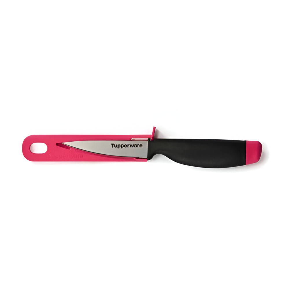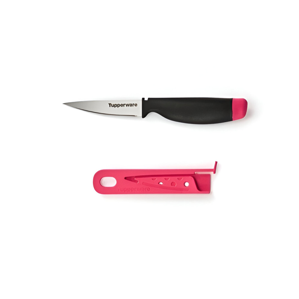 К ножу прилагается защитный чехол идентичного вставке малинового цвета с петелькой для размещения на крючке. Чехол надежно крепится на лезвии благодаря специальному выступу.
