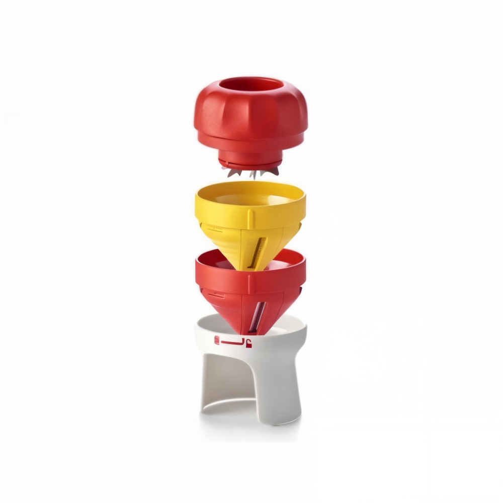 Tupperware овощерезка-спиралайзер состоит из держателя, конуса с острым лезвием и основания. Процесс нарезки прост: насадите овощ на держатель и вращайте его рукой. Лезвие конуса нарежет овощ на идеальные тонкие спирали. Благодаря особой нарезке, овощи быстрее маринуются и приобретают более насыщенный вкус.
