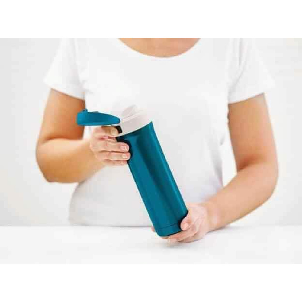 Термокружка чрезвычайно удобна в эксплуатации: открывается одной рукой. Чтобы открыть термокружку для питья, нажмите указательным пальцем на кнопку, вмонтированную в заднюю сторону крышки, и сдвиньте ее влево. Закрывается крышка стандартным образом: надавливанием до щелчка.